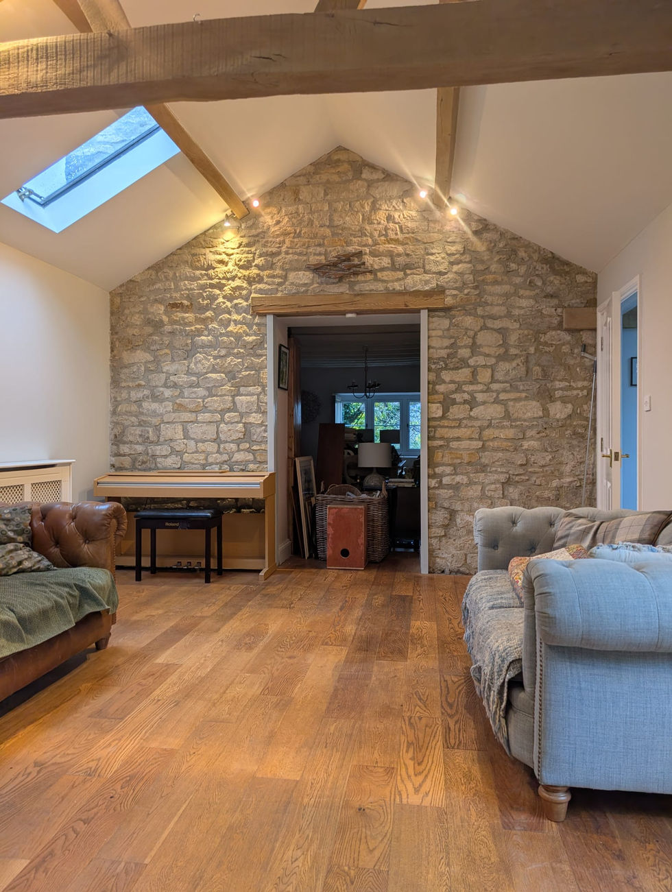This project presents cozy living room and kitchen designs with beige furniture, wood stove, stone wall, and wooden floor. The warm and inviting atmosphere makes these spaces perfect for relaxation and social gatherings.